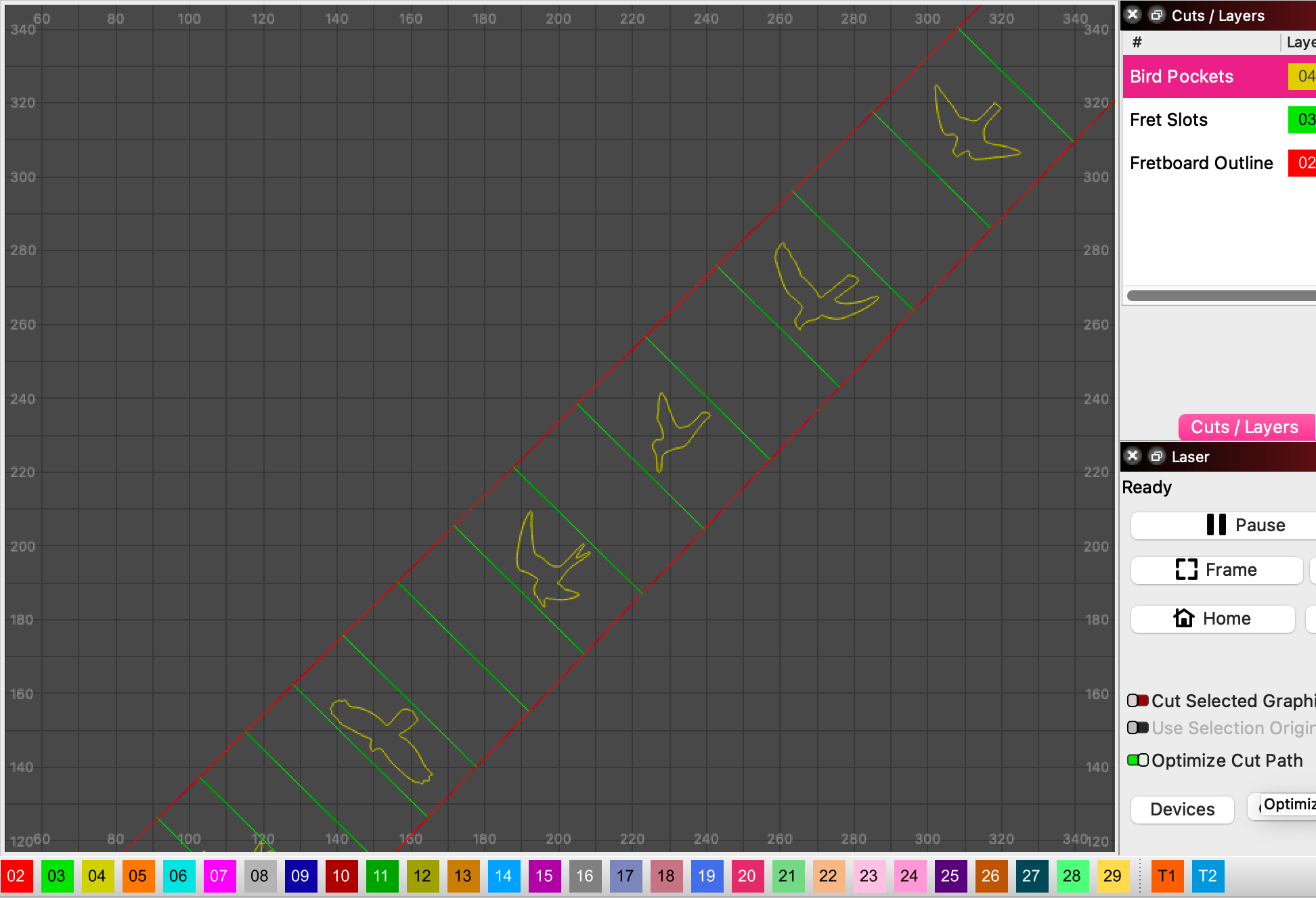 Lightburn file for burning a Bird Inlay fretboard. The settings provided may need to be edited to meet the hardness of your wood and material. 25.5" scale length